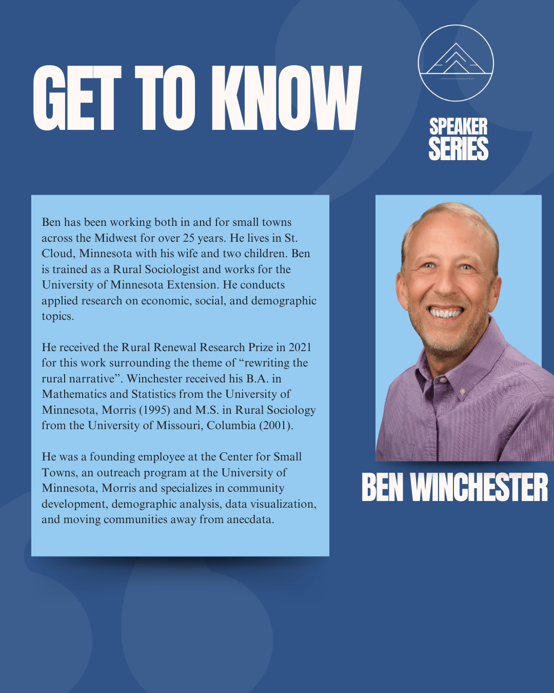 This session you'll hear from Ben Winchester, Rural Sociologist and Researcher. Ben has been working both in and for small towns across the Midwest for over 25 years. He lives in St. Cloud, Minnesota with his wife and two children, is trained as a Rural Sociologist and works for the University of Minnesota Extension. He conducts applied research on economic, social, and demographic topics. He received the Rural Renewal Research Prize in 2021 for this work surrounding the theme of “rewriting the rural narrative”. Ben will share his insights on community engagement and economic growth.