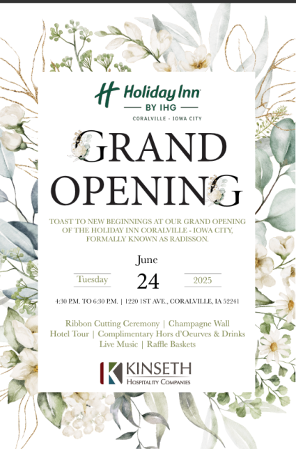 Join us for a celebratory Ribbon Cutting Ceremony, meet the team behind the transformation, and explore everything the revitalized hotel has to offer. Whether you're planning your next stay or searching for the perfect event venue, Holiday Inn Coralville-Iowa City is ready to serve the community with renewed style and service.